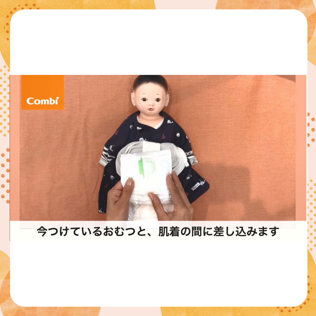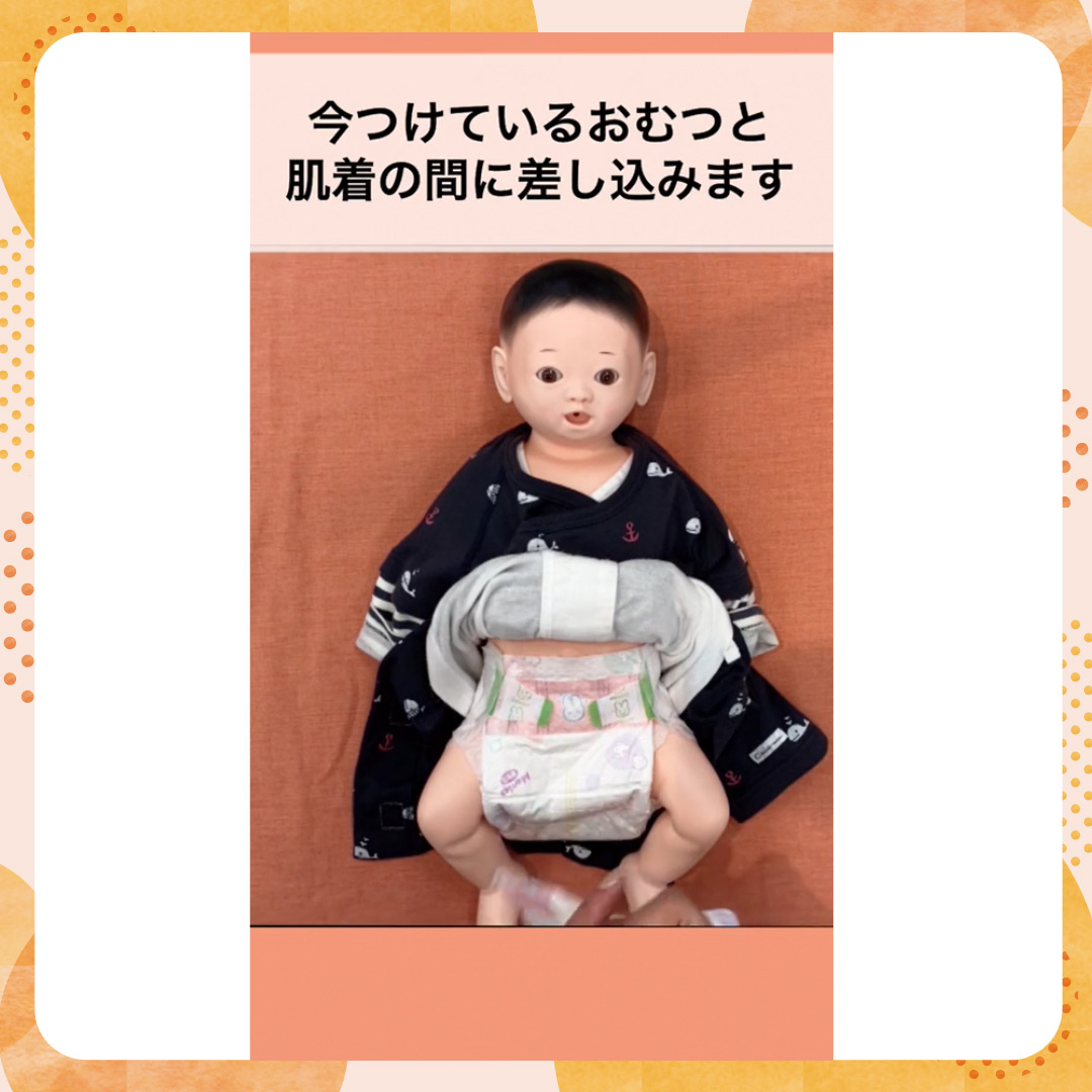 おむつ替えの手順です。紙おむつをお持ちの方は、ご準備ください。1枚をつけた状態で、交換用のおむつもあると、おむつ交換の練習ができます。