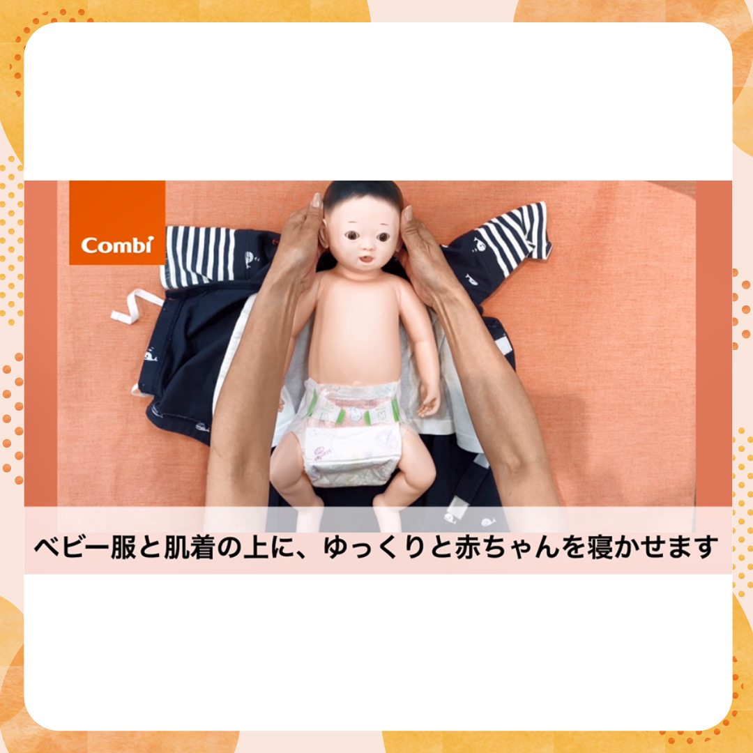 お着替え(ワンタッチ肌着&ラップクラッチ)の手順です。肌着とベビー服をお持ちの方は、2枚を重ねて広げてご準備ください。