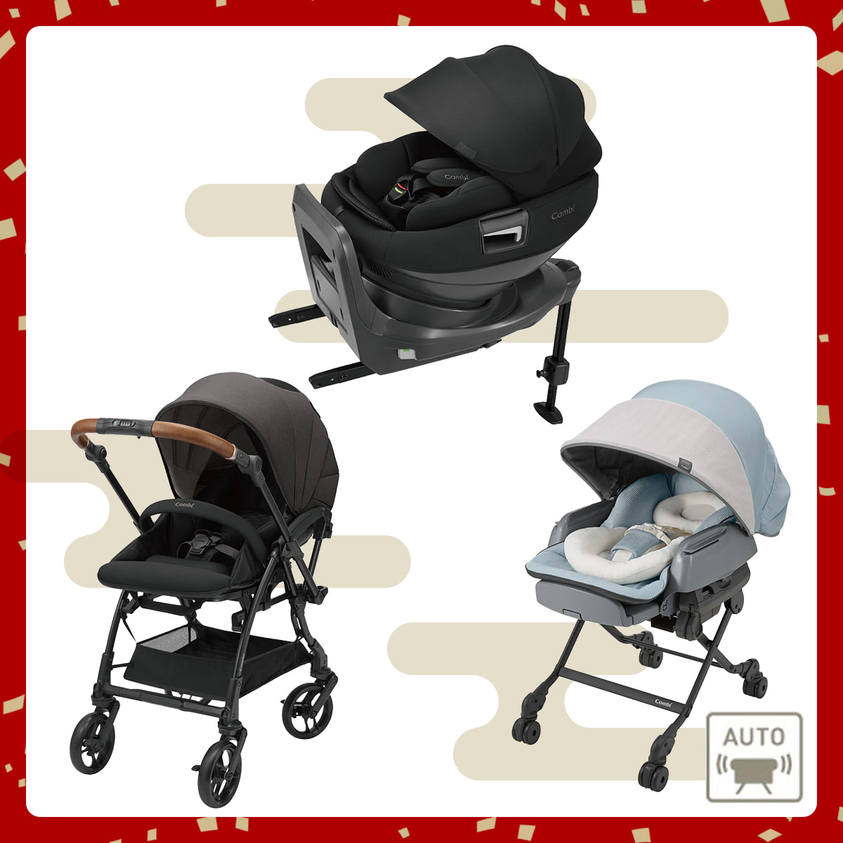 数量限定!シートが動いて赤ちゃんがグッと近付く、シンクロシート搭載ベビーカー「スゴカルS JA」、セパレートチャイルドシートのプレミアムモデル「THE S plus ZF」、眠りに理想的な暗さをつくるスリープシェルを搭載した電動ベビーラック&チェア「ネムリラ AUTO SWING BEDi Long スリープシェル EG」がセットになったご出産準備におすすめの福袋。